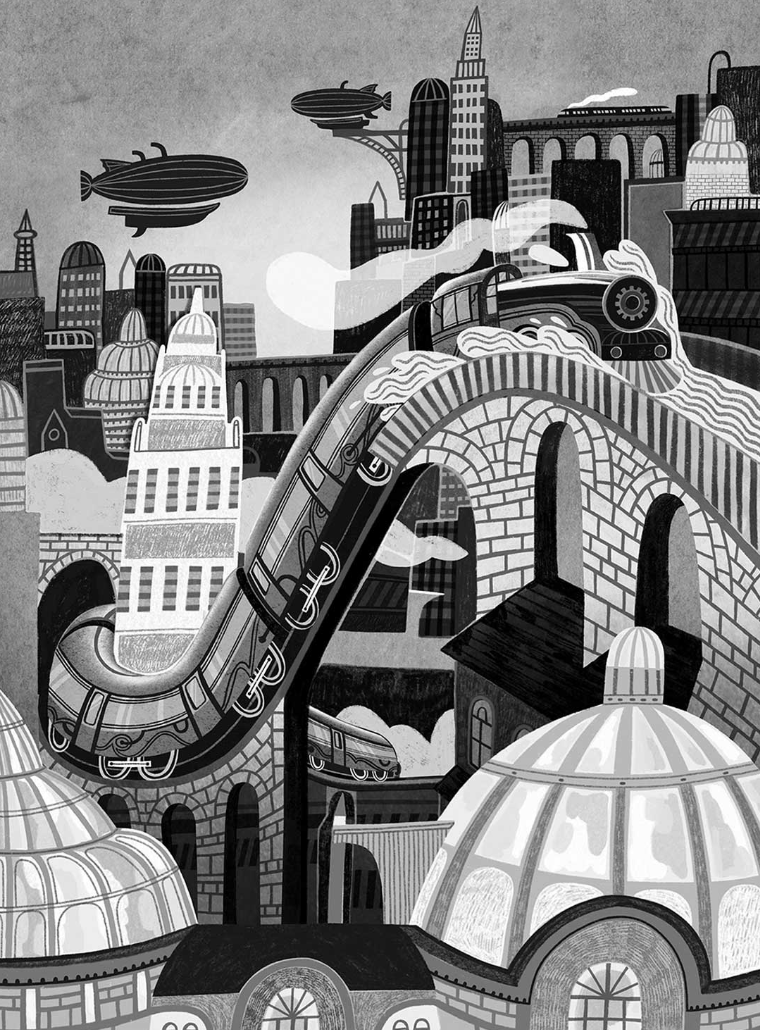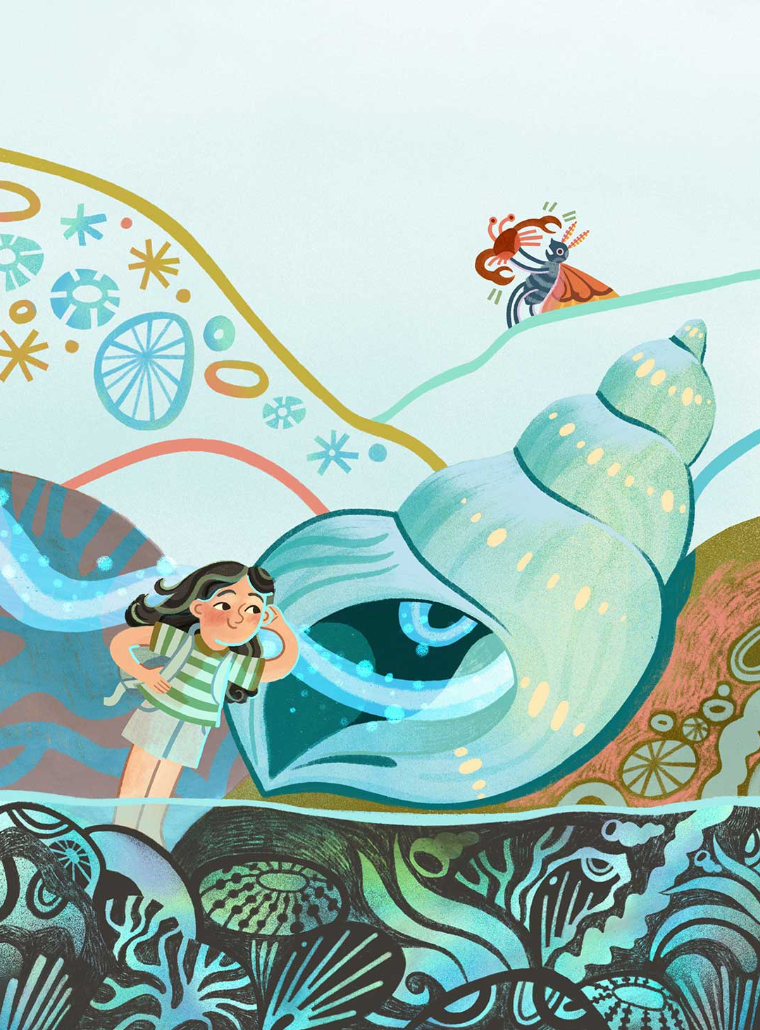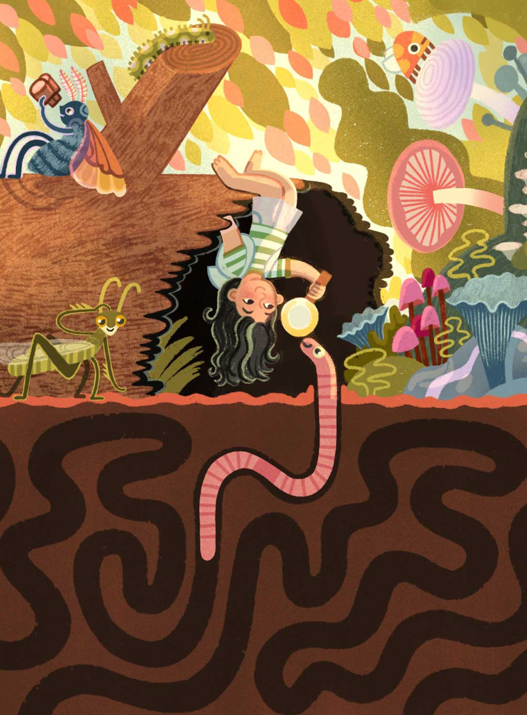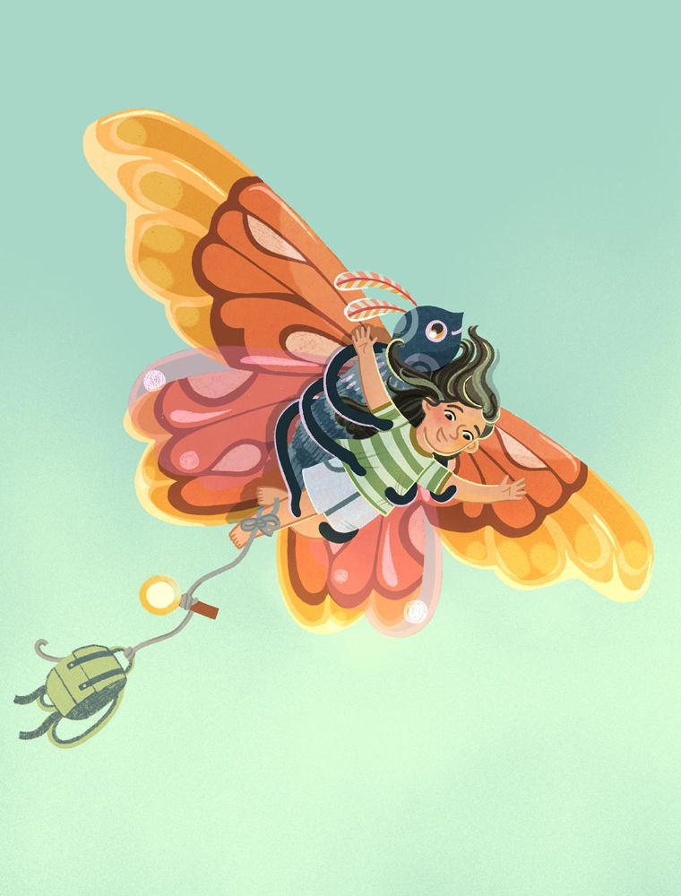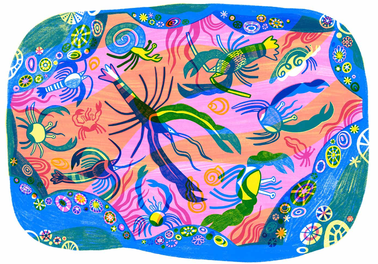 My pictures are bright and playful. I work in sections, making small paintings with gouache and power inks and then later add all the fine details with coloured pencil and crayons. I then compose the sections together digitally, drawing on my iPad and collaging in handmade textures.